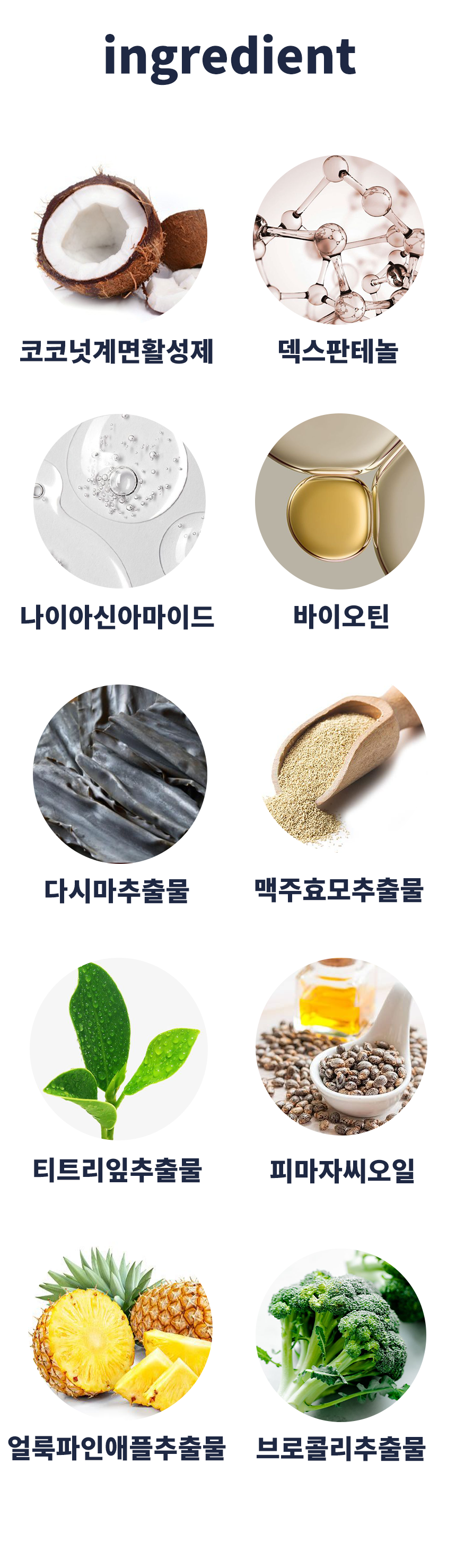 소듐코코일이세티오네이트, 옥수수전분 ,정제수, 글리세린, 코코넛애씨드, 코코-베타인, 피마자씨오일, 소듐이세티오네이트, 스테아릴알코올, 솔비탄카프릴레이트, 코코넛야자오일, 트레할로오스, 세틸알코올, 레불리닉애씨드, 덱스판테놀, 브로콜리추출물, 나이아신아마이드, 바이오틴, 울금뿌리추출물, 얼룩파인애플추출물, 부틸렌글라이콜, 치자추출물, 폴리글리세릴-3폴리리시놀리에이트, 다시마추출물, 1,2-헥산다이올, 미리스틸알코올, 아라키딜알코올, 시트릭애씨드, 맥주효모추출물, 티트리잎추출물, 향료, 알파-아이소메틸아이오논, 시트로넬올, 리모넨, 제라니올, 헥실신남알, 리날룰
