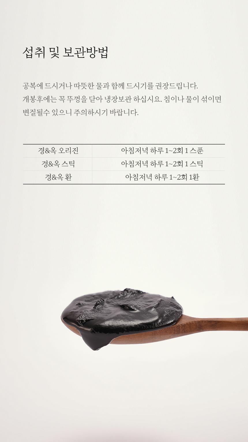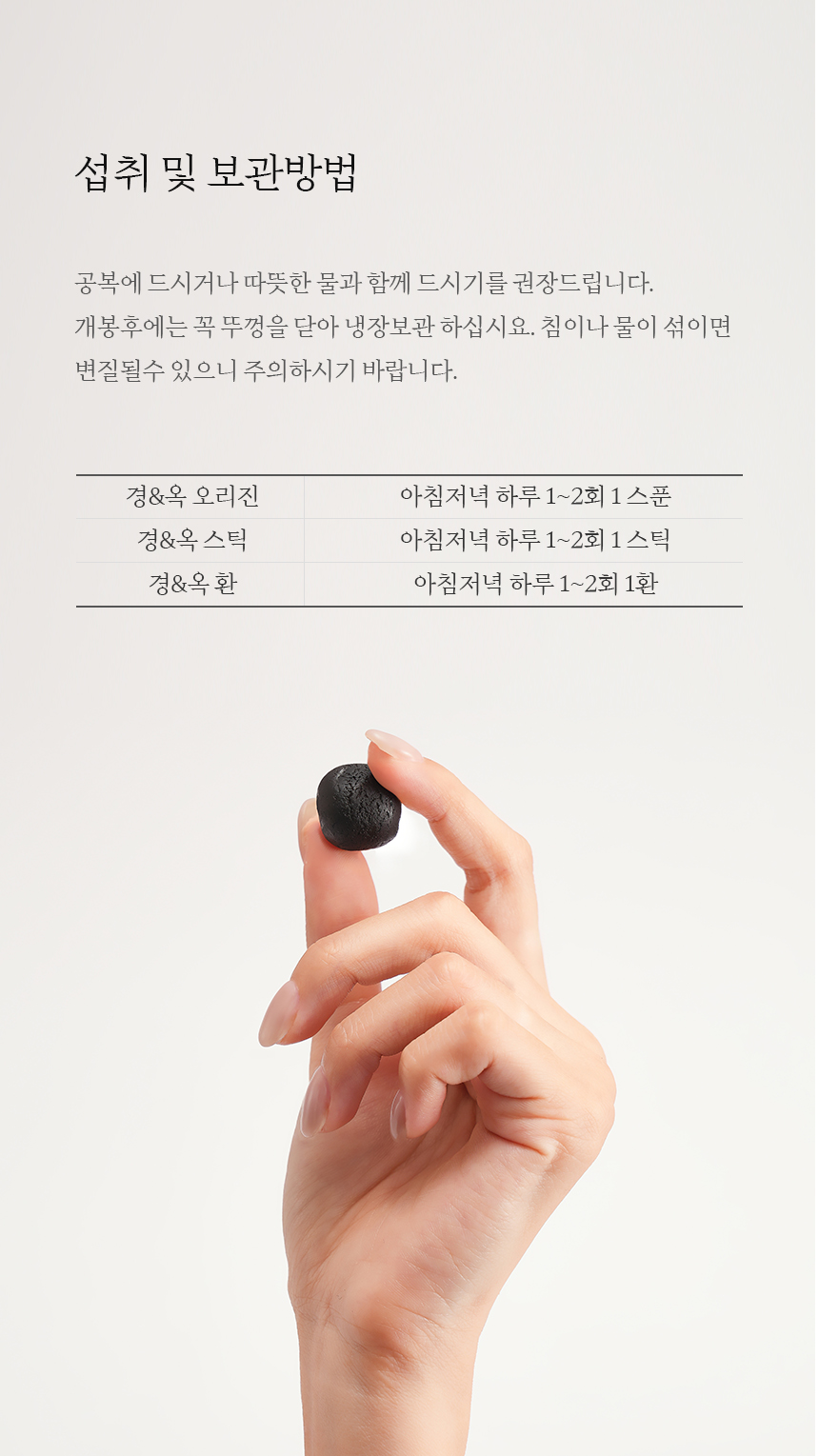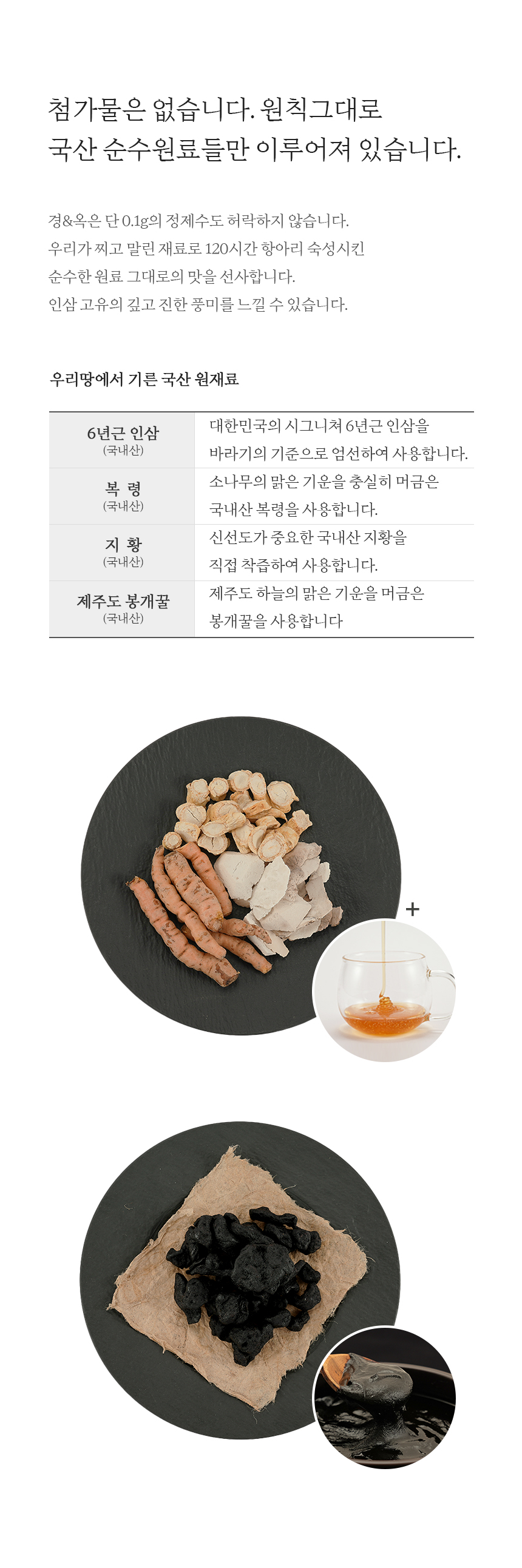 우리 땅에서 기른 국산 원재료(국내산 6년근 인삼, 복령, 지황, 제주도 봉개꿀)로 만든 경 & 옥입니다.