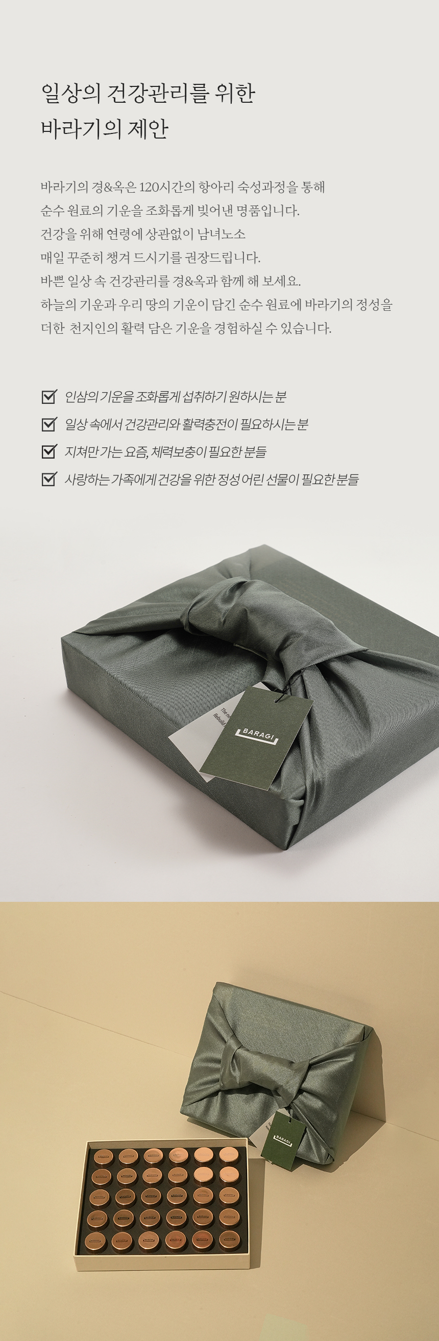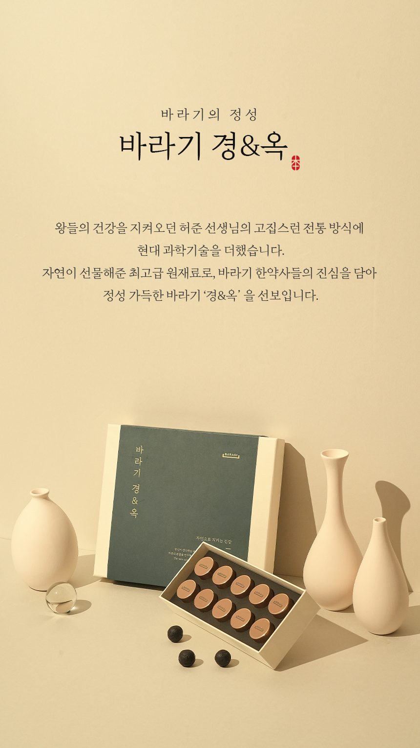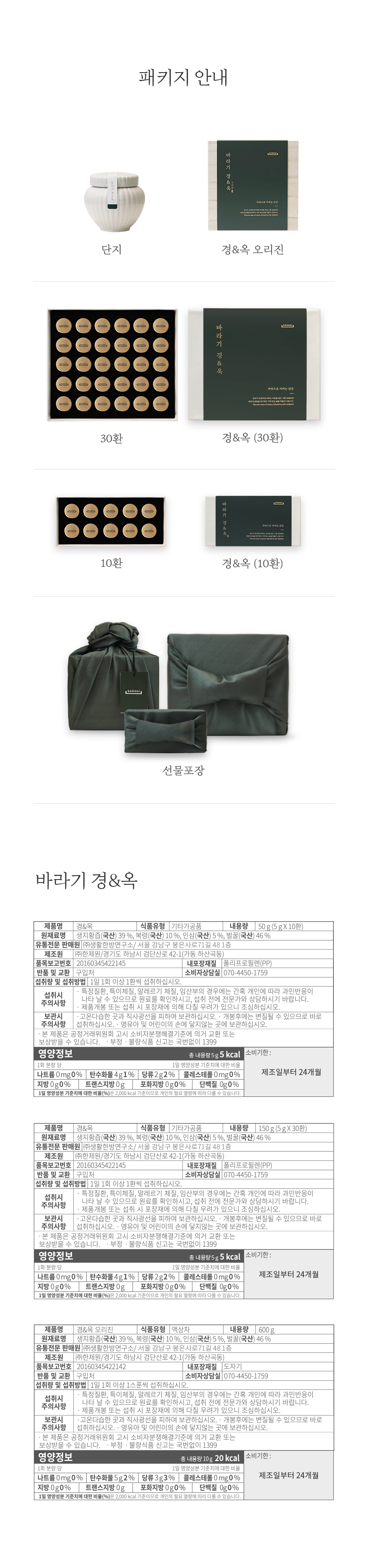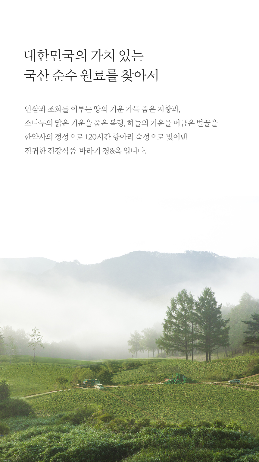 우리 땅에서 기른 국산 원재료(국내산 6년근 인삼, 복령, 지황, 제주도 봉개꿀)로 만든 경 & 옥입니다.