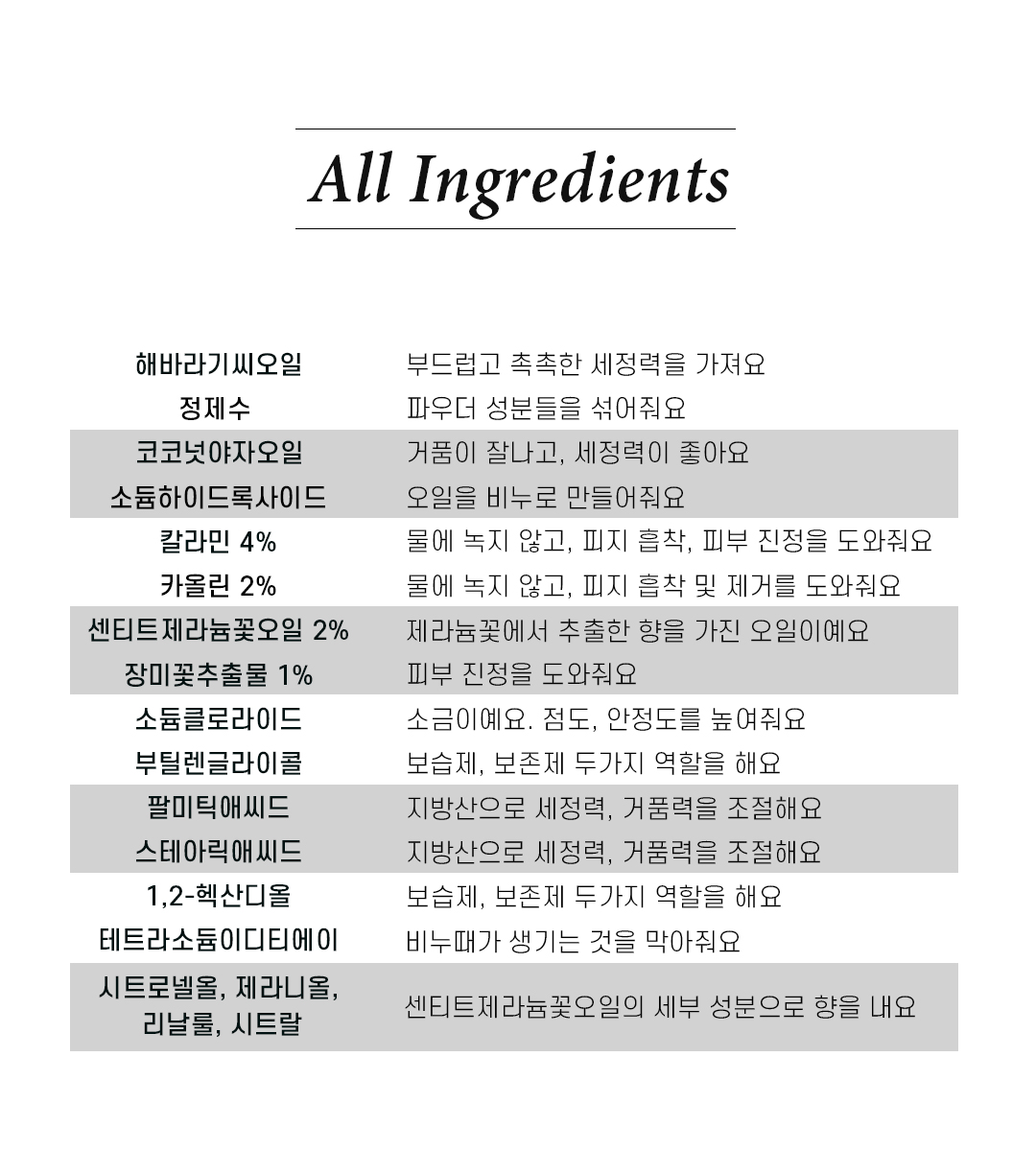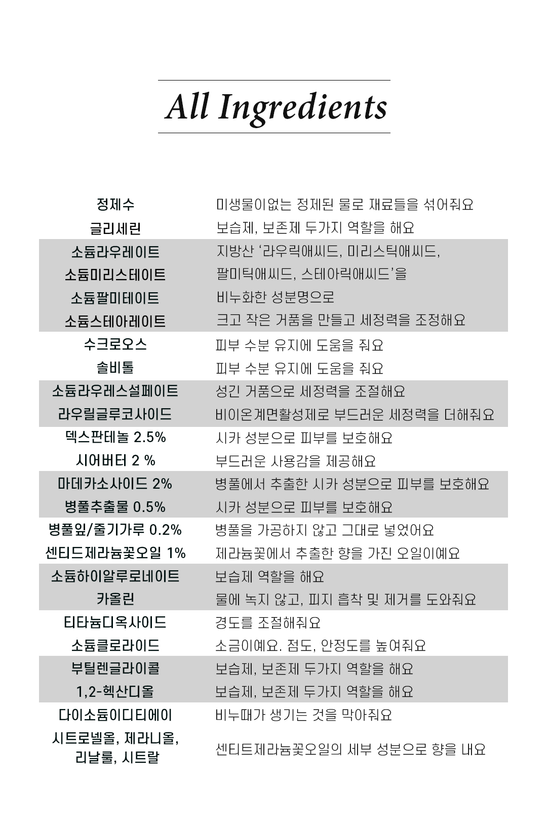 정제수, 글리세린, 소듐라우레이트, 소듐미리스테이트, 소듐팔미테이트, 소듐스테아레이트, 수크로오스, 솔비톨, 소듐라우레스설페이트, 라우릴글루코사이드, 덱스판테놀(2.5%), 시어버터(2%), 마데카소사이드(2%), 병풀추출물(0.5%), 병풀잎/줄기가루(0.2%), 센티드제라늄꽃오일(1%), 소듐하이알루로네이트, 티타늄디옥사이드, 카올린, 소듐클로라이드, 부틸렌글라이콜, 1,2-헥산다이올, 다이소듐이디티에이, 시트로넬올, 제라니올, 리날룰, 시트랄
