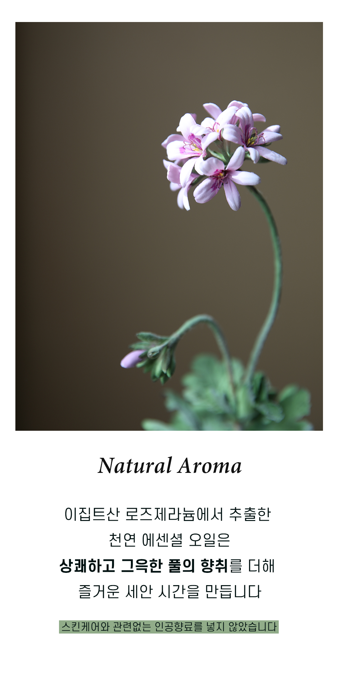 화학성분 사용을 줄이기 위해 천연향(로즈제라늄 오일)만 첨가하였습니다