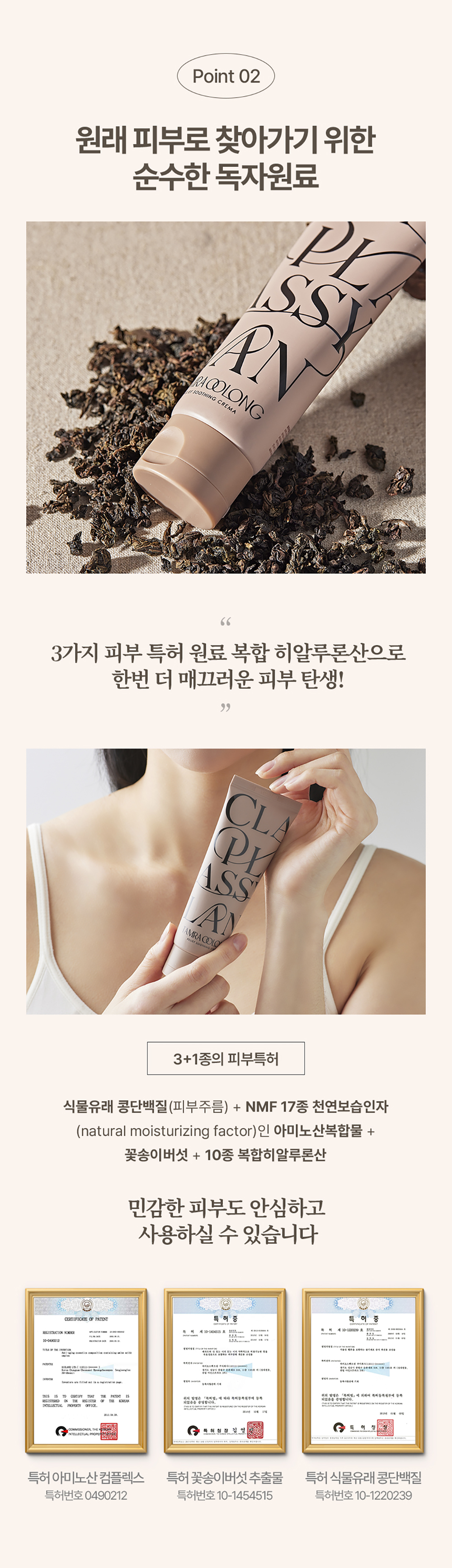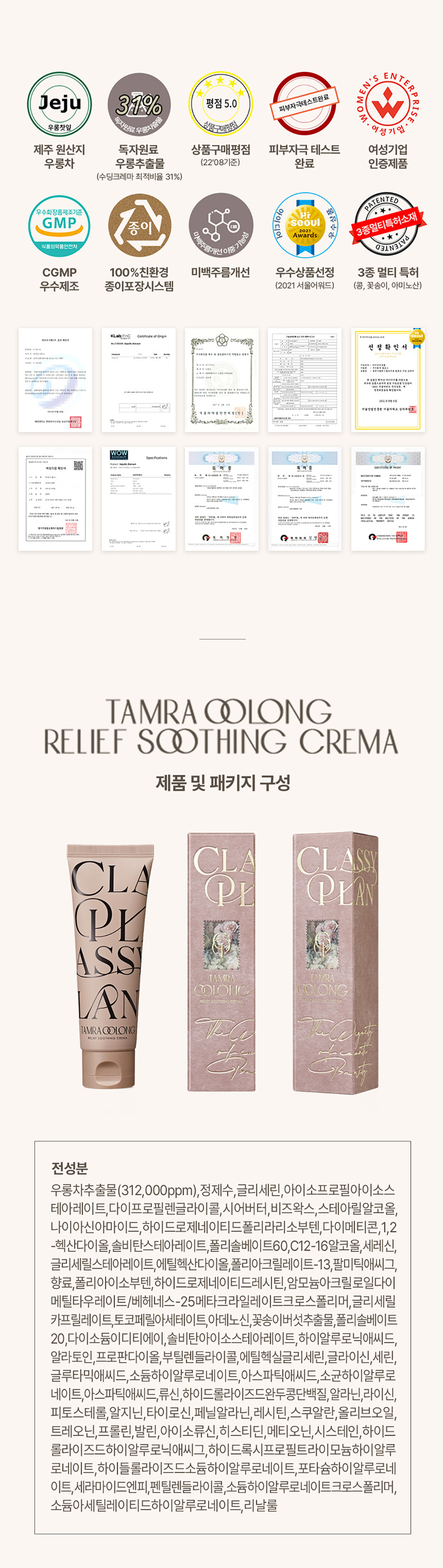 촘촘한 크레마를 농축시켜놓은 크림의 튜브형 기초크림을 발라도 곧바로 건조해지는 피부타입 / 진한크림을 바르면 금방 올라오는 내 피지 뽀송뽀송한 피부에 수분만 남겨두는 고용량의 릴리프 수딩 크레마. 31%의 고함량의 우롱 크레마 히알루론산 컴플렉스 / 피부구성성분의 아미노산 복합체 / 미백주름개선 이중기능성 피부 저자극 테스트 완료 / 우수상품 선정