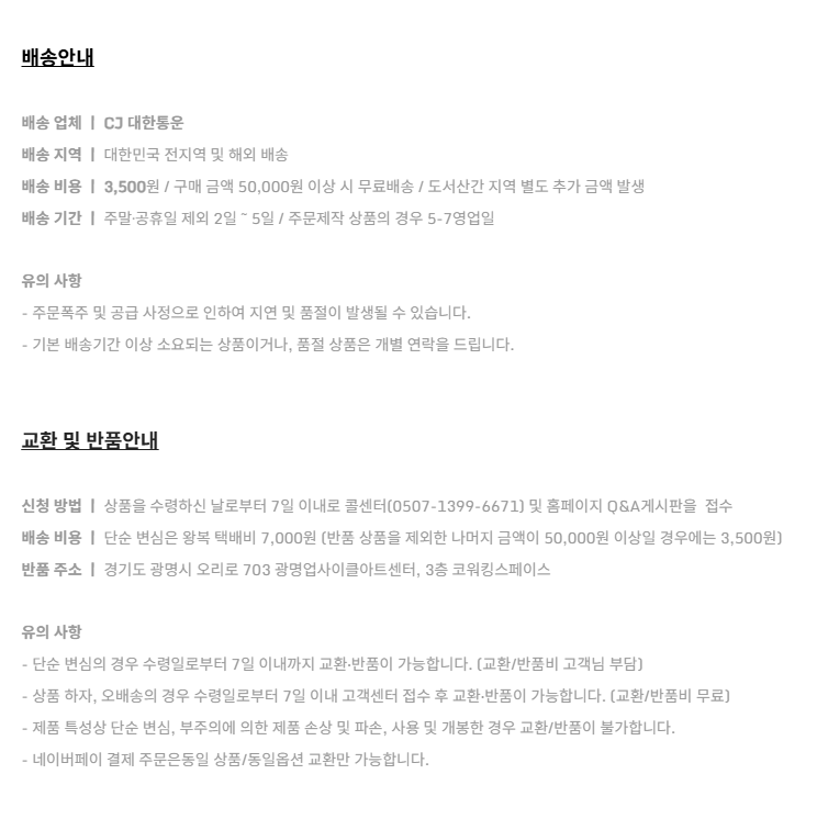 - 제주 및 도서산간 지역은 출고, 반품, 교환시 추가 배송비(항공, 도선료)가 부과 될 수 있습니다.