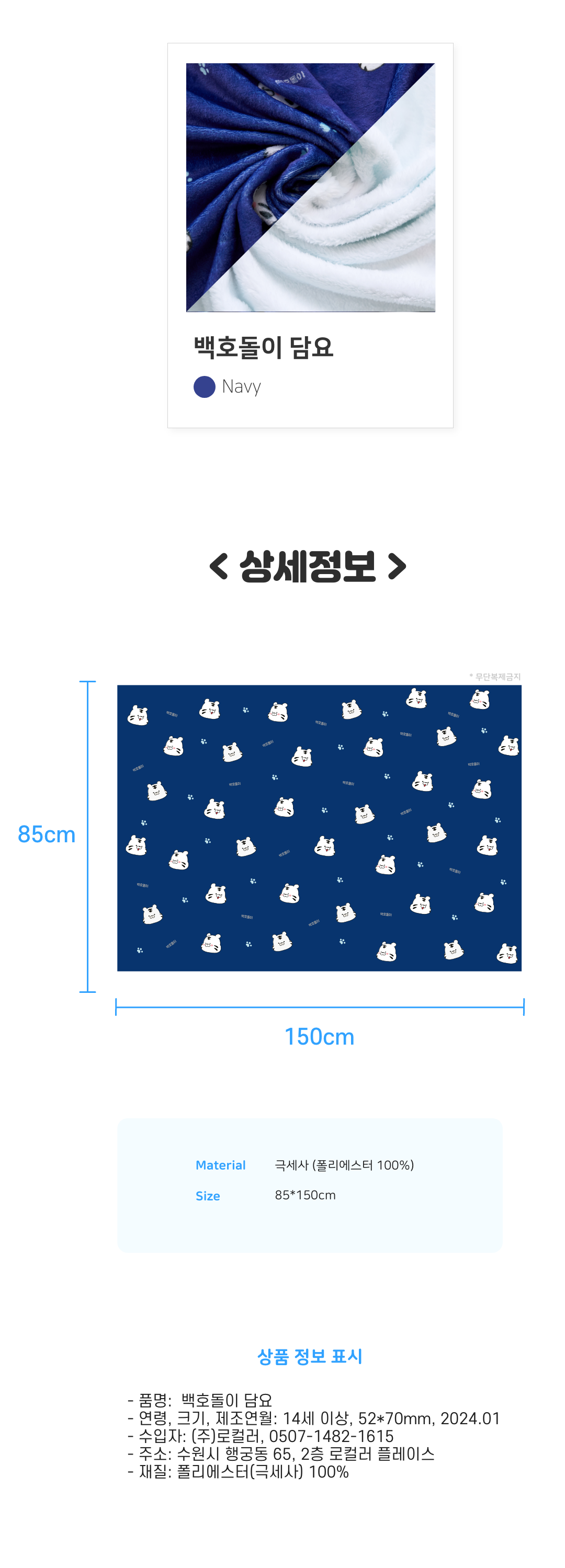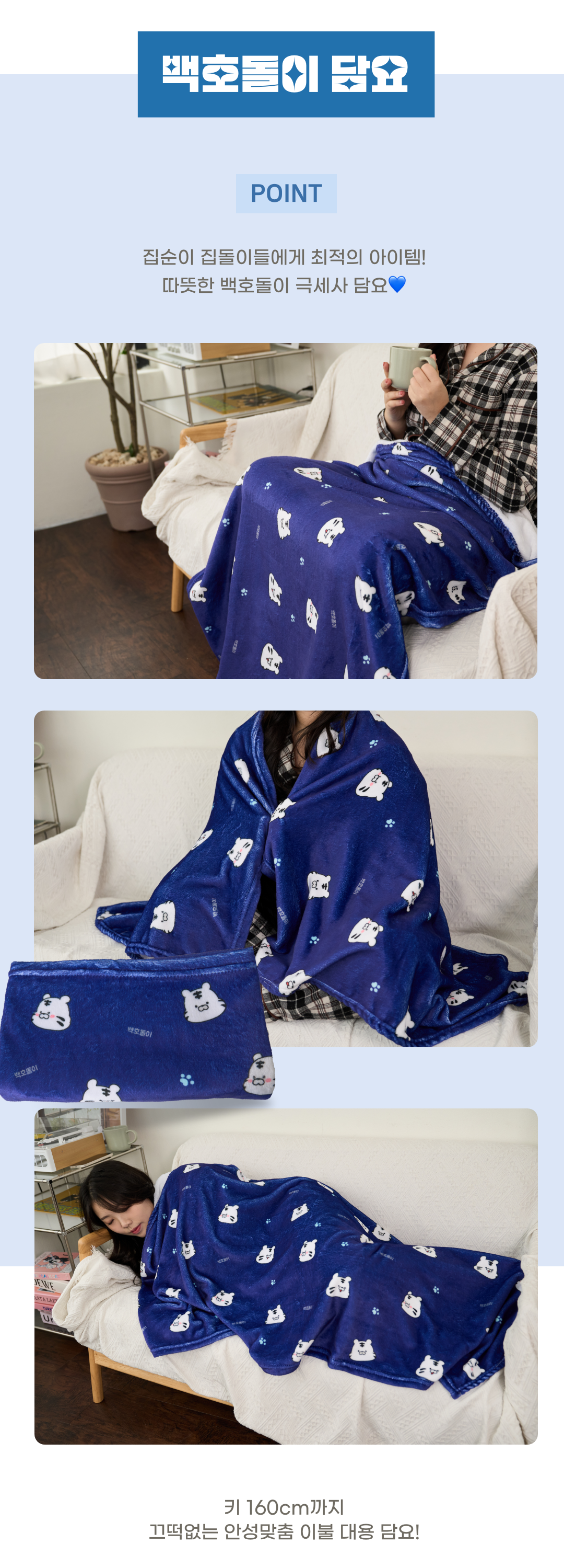 국민체육진흥공단 공식 마스코트 캐릭터 '백호돌이'가 담요로 찾아왔습니다. 극세사 담요로 여름엔 사무실에서, 겨울엔 집에서 따뜻하게 이용하세요.
