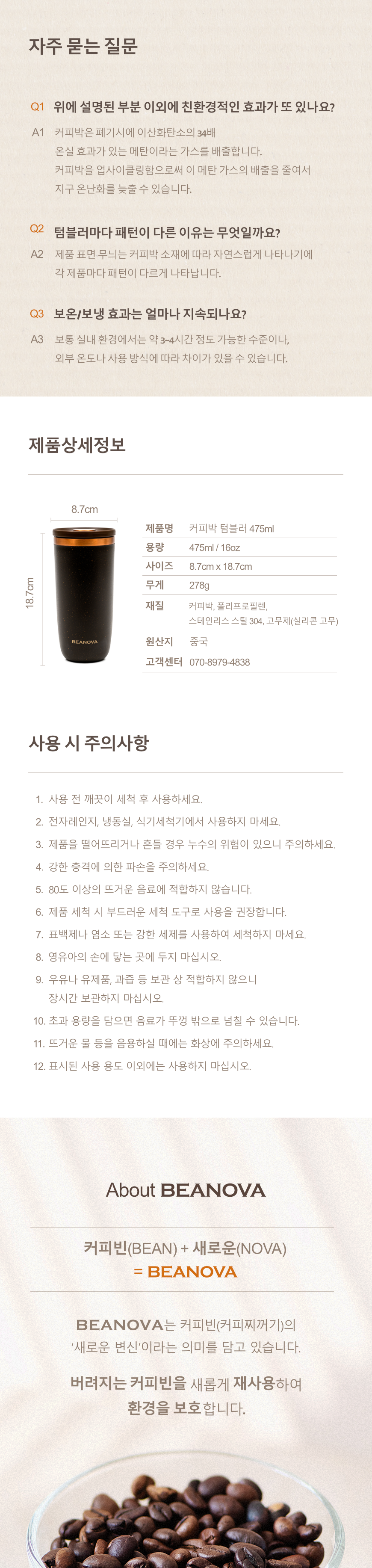 [빈노바] 커피박 업사이클링 텀블러 475ml, 친환경 보온·보냉 겸용