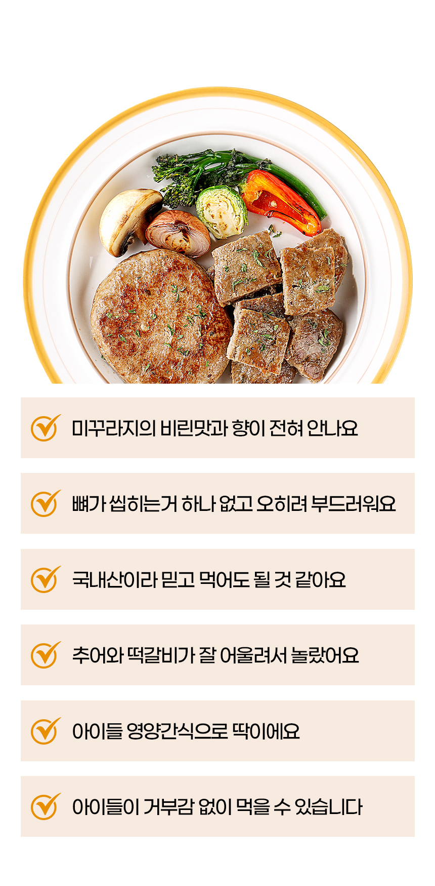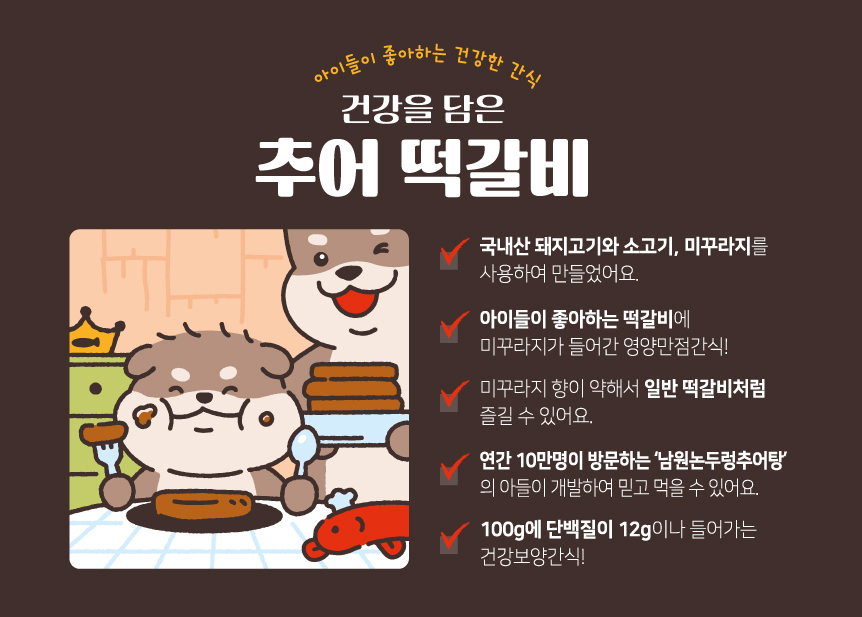 국내산 돼지고기, 소고기, 미꾸라지를 사용하여 풍부한 육즙과 풍미를 느낄 수 있으며, 아이들에게 건강한 간식이나 반찬으로 더 없이 좋은 추어 떡갈비입니다.