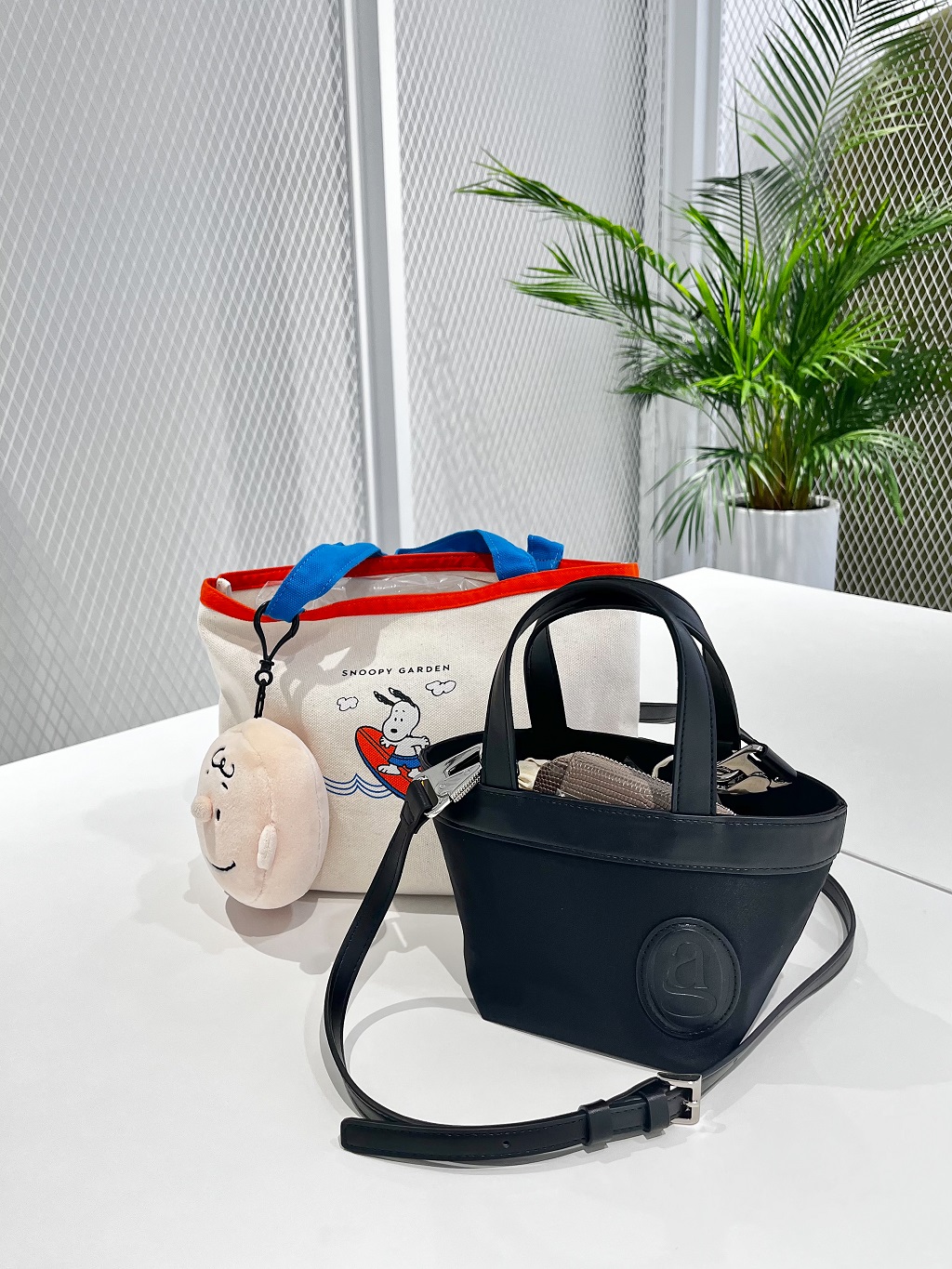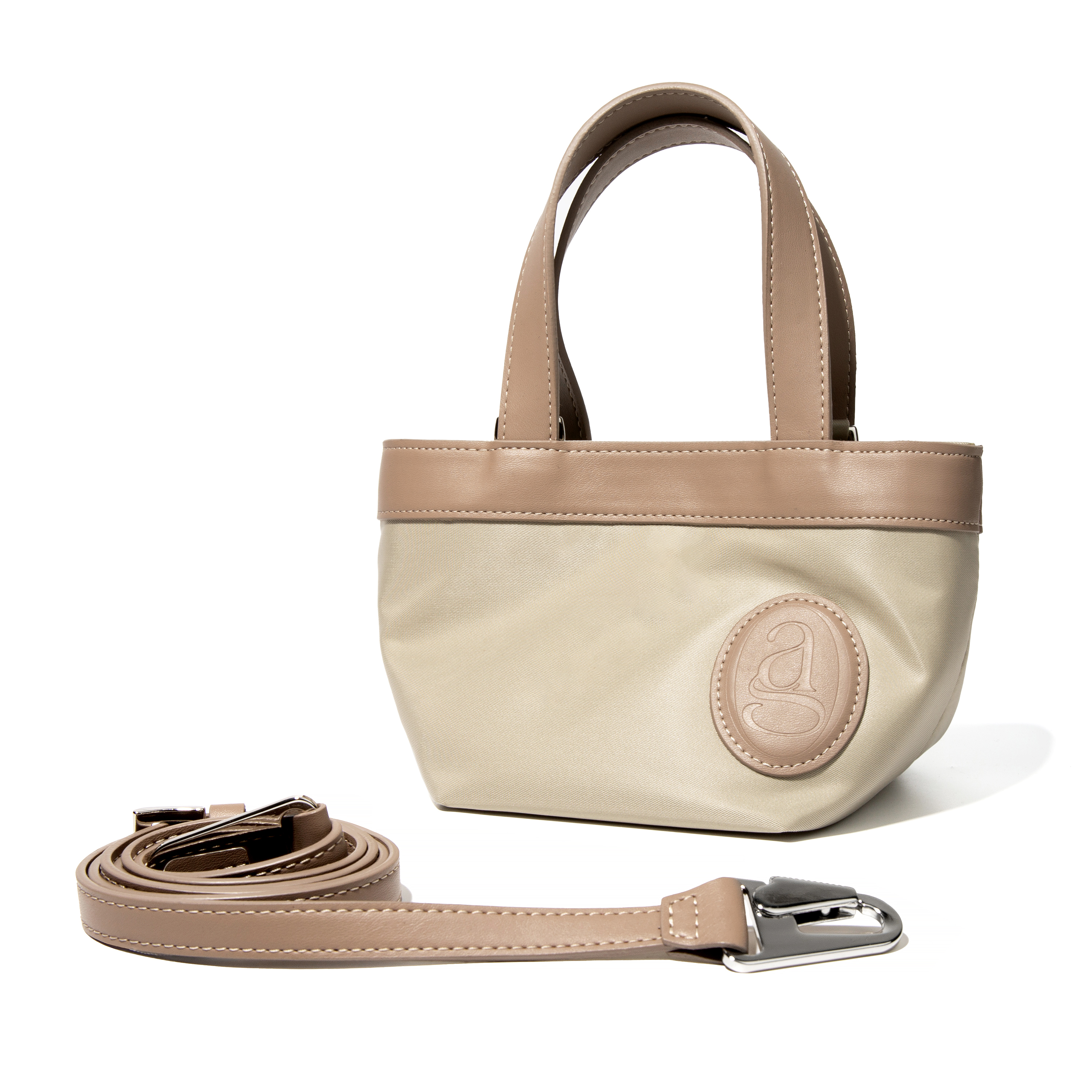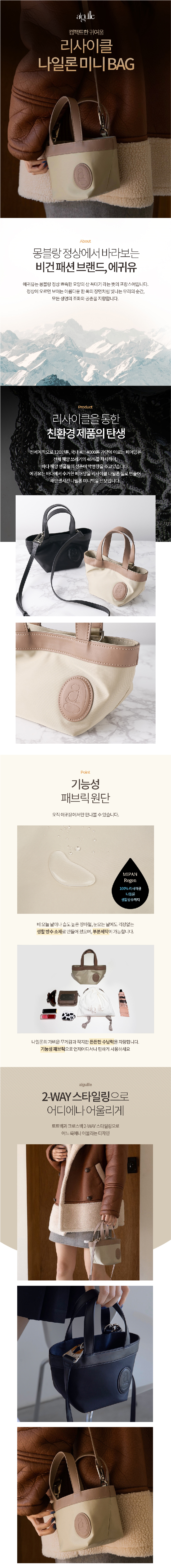 오션플라스틱 재생원단으로 만든 리사이클 나일론 미니백입니다. 가벼운 무게감과 미니멀한 디자인에 에귀유의 로고불박으로 포인트를 준 토트백 겸 크로스백